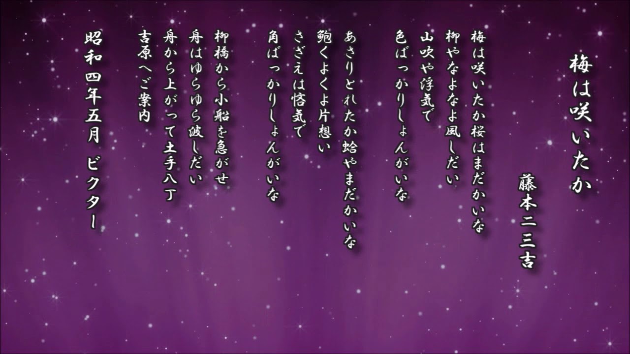 題名と冒頭の一文を、端唄「梅は咲いたか」に由来。